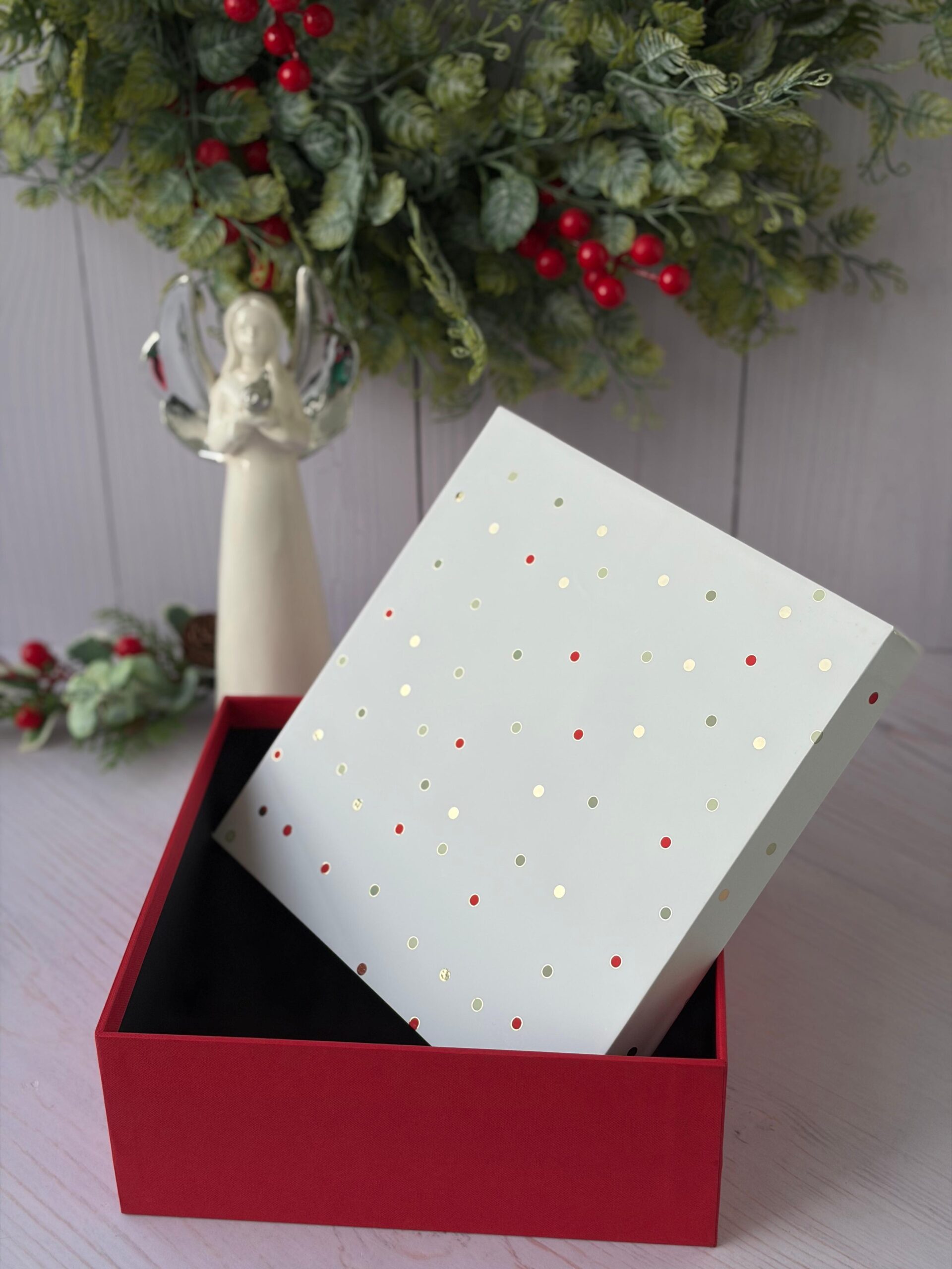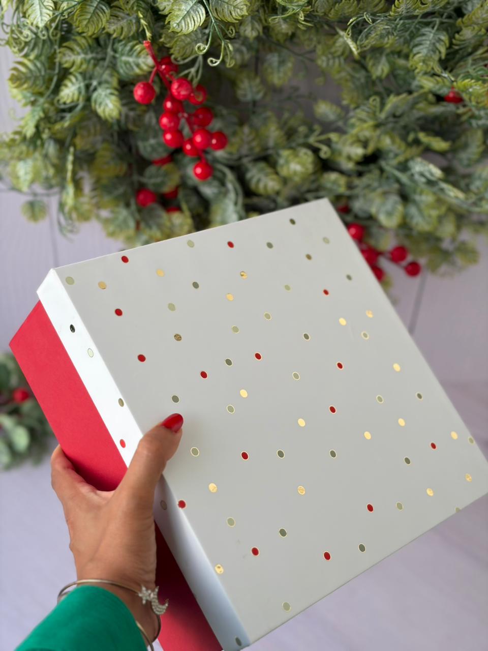 > RIGID BOX – 9 x 9 x 3.5 ( CHRISTMAS Foiled Polka dots )